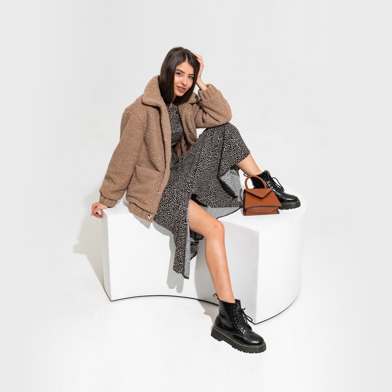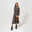 فستان أسود مع طبعات بيضاء منقطة ، له رقبة مستديرة ، أكمام ثلاثة أرباع.