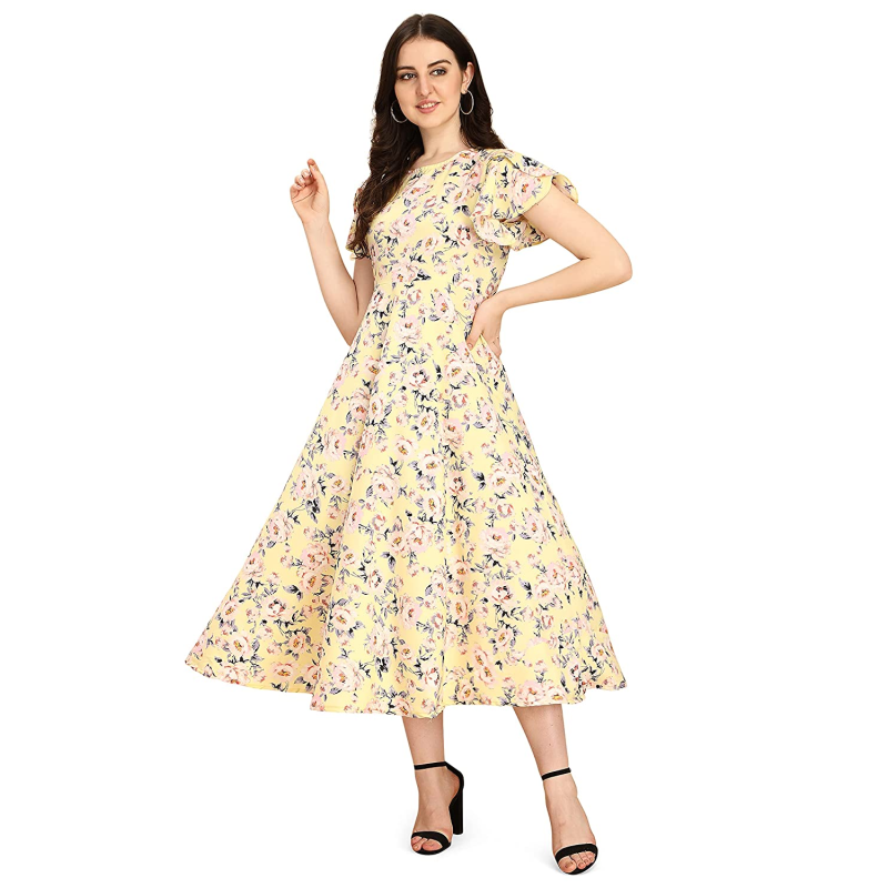 • Ankle length A-line dress with butterfly sleeves and boat neck