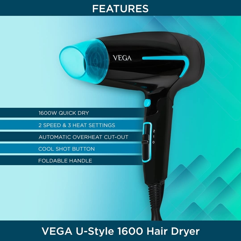 Vega U-Style 1600 Watts Foldable Hair Dryer For Men & Women With Cool Shot Button