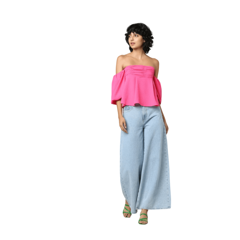 هاربا بلوزة بأكتاف مكشوفة باللون الوردي