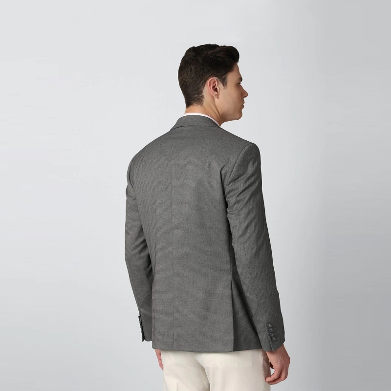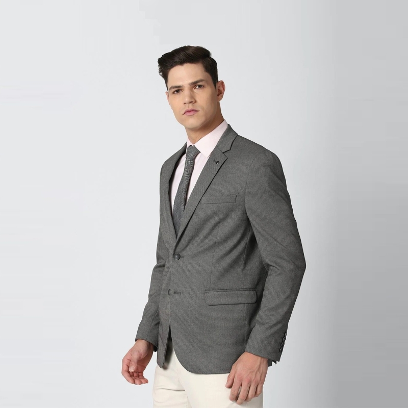 رمادي تصميم ذاتي نحيف يناسب سترة رسمية ، لديه طوق طية صدر محززة ، أكمام طويلة مع أزرار ، صدر واحد مع إغلاق زر ، 2 جيوب وهمية مع لوحات ، 1 جيب على الصدر و 2 جيوب داخلية ، بطانة متصلة ، حافة خلفية مزدوجة التهوية.