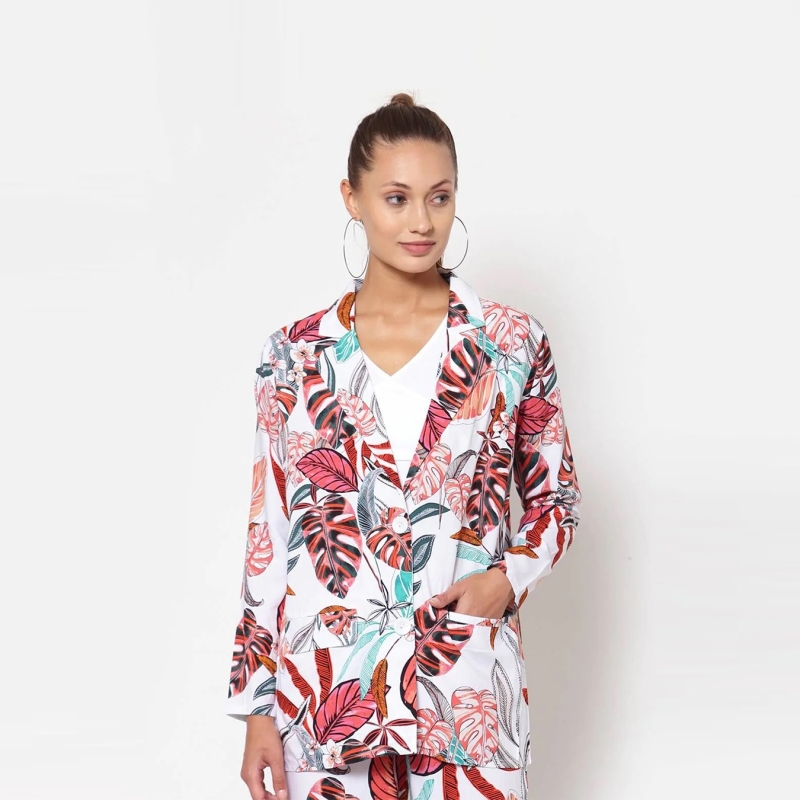 بليزر أبيض مطبوع بالورود بصدر واحد، بياقة طية صدر مسننة، أكمام قصيرة