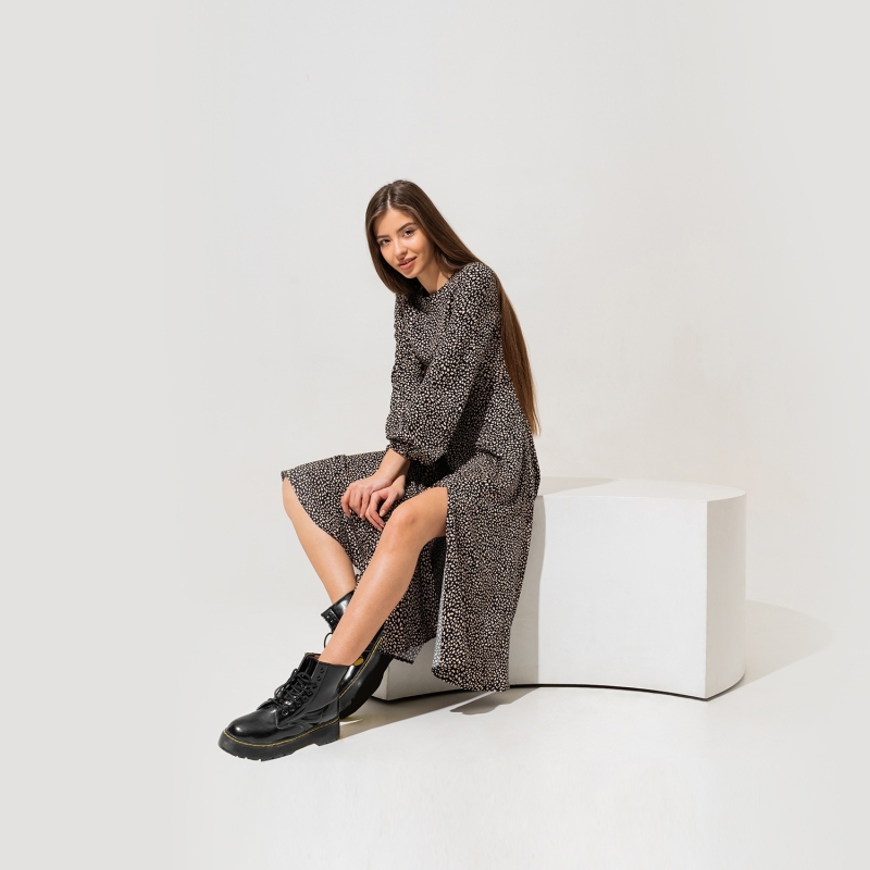 فستان أسود مع طبعات بيضاء منقطة ، له رقبة مستديرة ، أكمام ثلاثة أرباع.