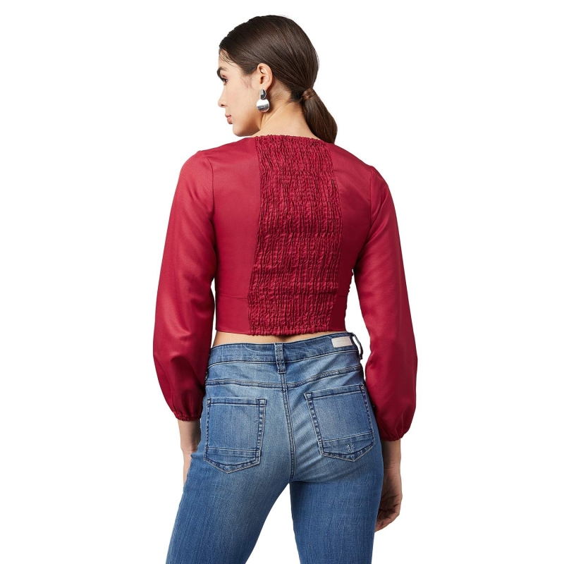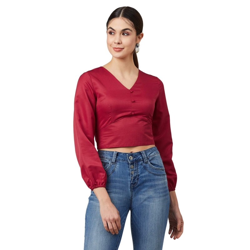• Women Casual Maroon Solid Long Sleeves V-Neck Top