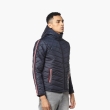 The Navy blue geometric self-design windcheater quilted jacket, has a hood, 2 pockets, a zip closure, long sleeves, a straight hemline, and polyester lining.