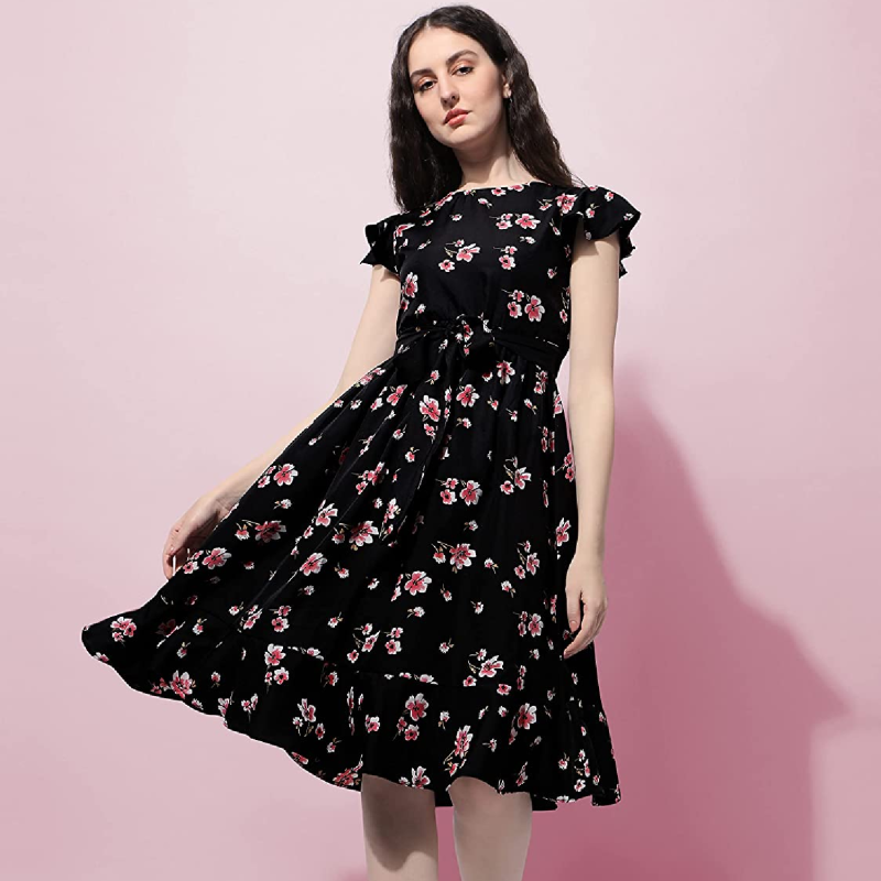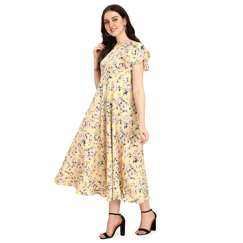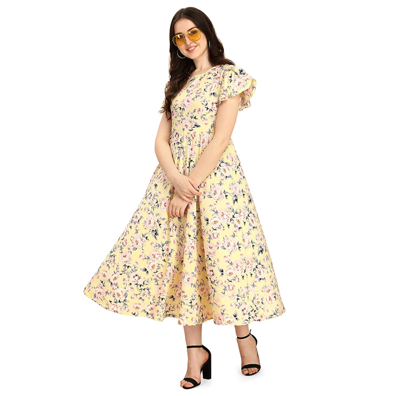 • Ankle length A-line dress with butterfly sleeves and boat neck