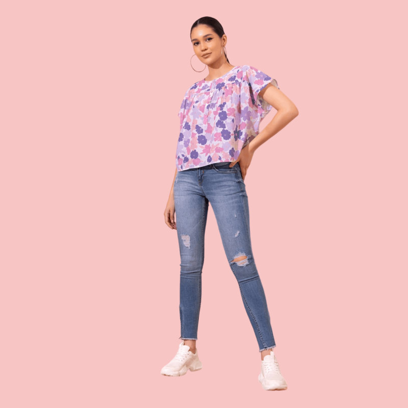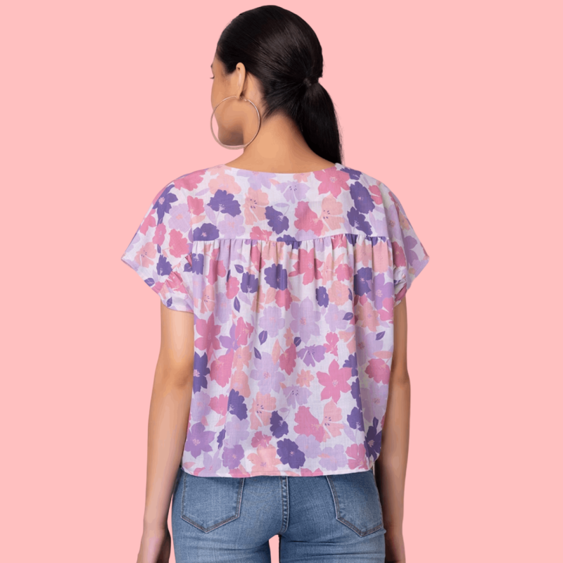 صمم بأكمام قصيرة وفتحة رقبة مستديرة ونقشة زهور بالكامل.