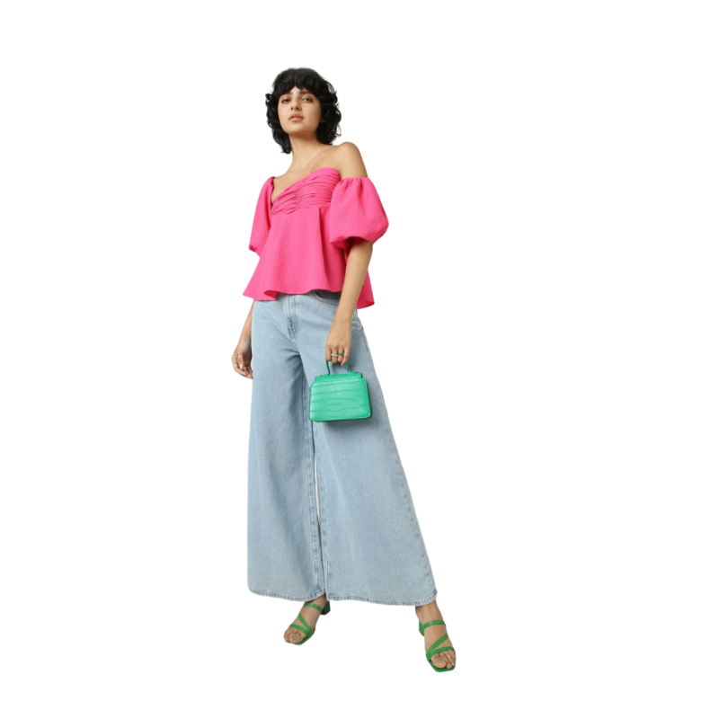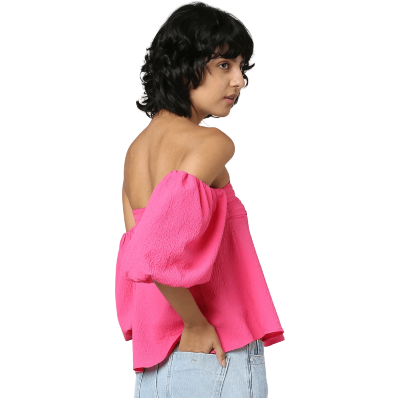 هاربا بلوزة بأكتاف مكشوفة باللون الوردي