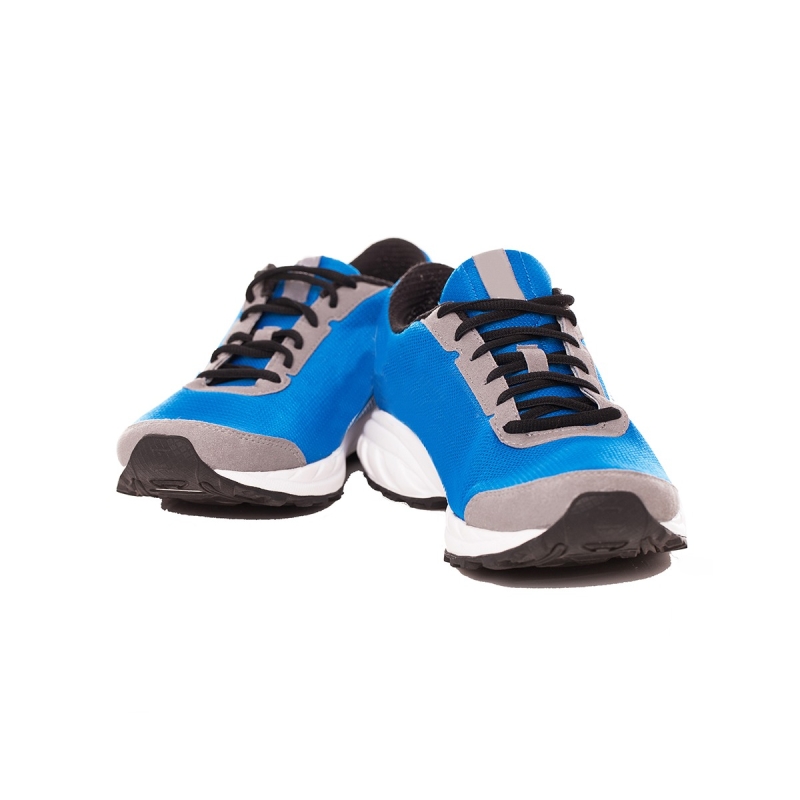 زوج من أحذية الجري الزرقاء ، مع تصميم منتظم ، تفاصيل الأربطة
