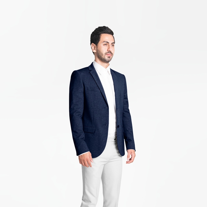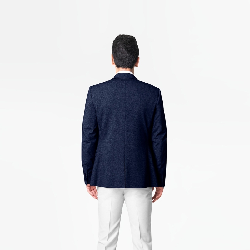 بليزر رسمي بقصة ضيقة باللون الأزرق الداكن، بياقة طية صدر مسننة، أكمام طويلة، جيبان بغطاء قلاب وجيب صدر واحد، صدر واحد مع زر للإغلاق وفتحة مزدوجة عند الحاشية