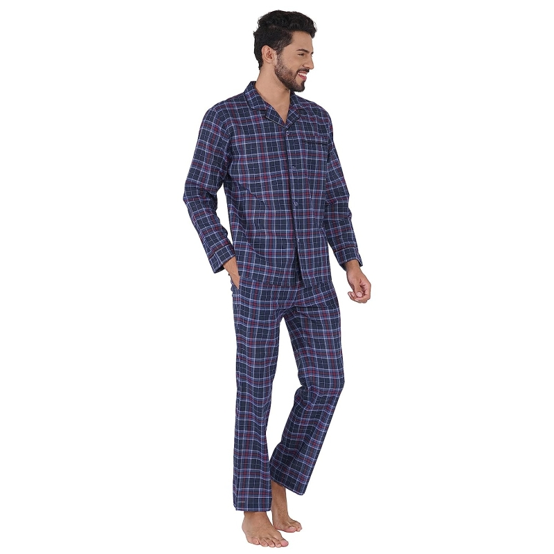 الرجال الأزرق الشيكات قميص طويل الأكمام مع مجموعة بيجاما مرنة
