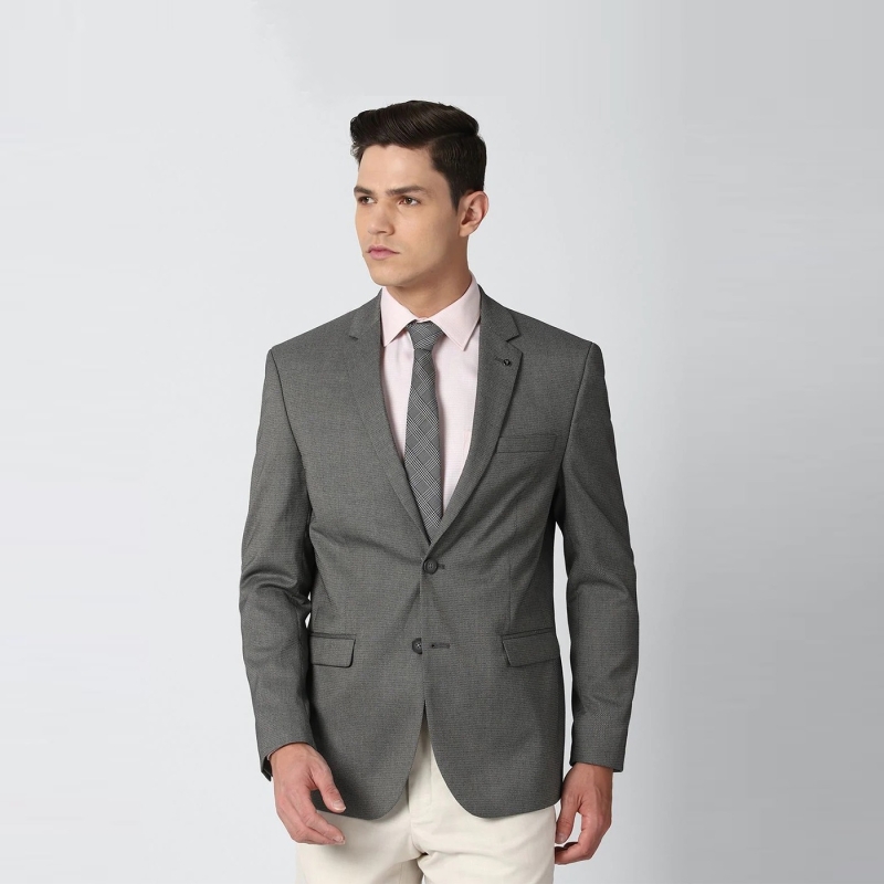 رمادي تصميم ذاتي نحيف يناسب سترة رسمية ، لديه طوق طية صدر محززة ، أكمام طويلة مع أزرار ، صدر واحد مع إغلاق زر ، 2 جيوب وهمية مع لوحات ، 1 جيب على الصدر و 2 جيوب داخلية ، بطانة متصلة ، حافة خلفية مزدوجة التهوية.