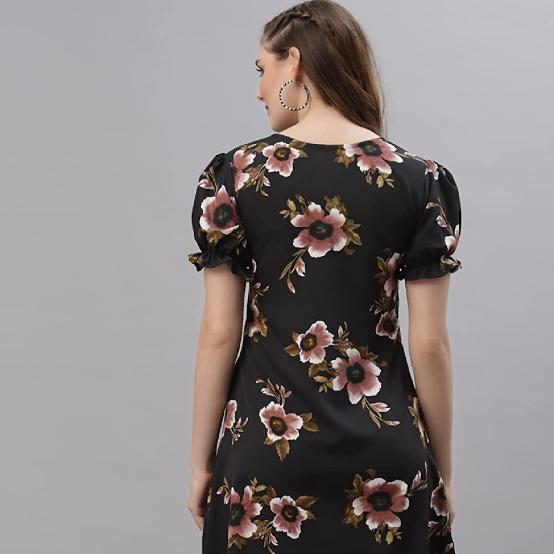 الجاذبيه! فستان قصير على شكل حرف A من قماش الكريب مع فتحة رقبة V وأكمام منفوخة