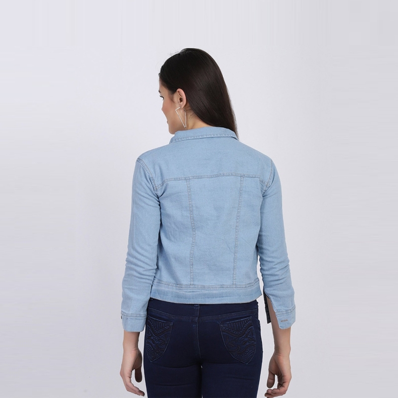 سترة الدنيم الصلبة الصلبة خفيفة الوزن ، لديها طوق انتشار ، 2 جيوب ، لديه زر إغلاق ، ثلاثة أرباع الأكمام ، حاشية مستقيمة ، بطانة قطنية.