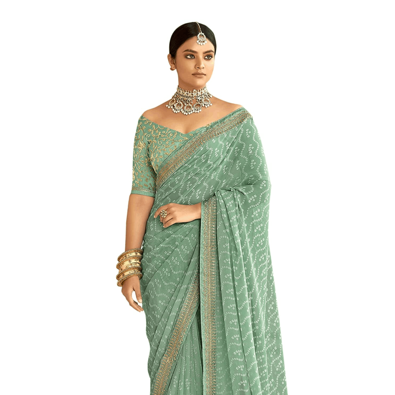 المرأة Bandhani الطباعة والتطريز العمل في الدانتيل جورجيت ساري